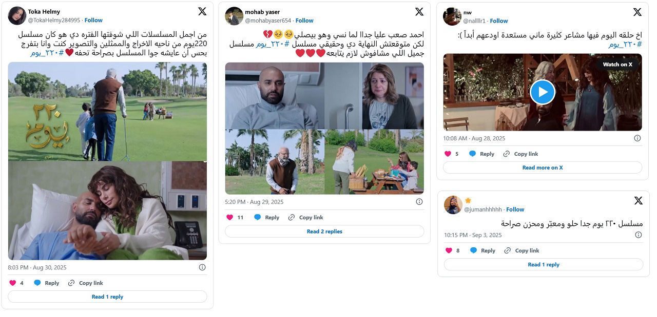 في النهاية، "220 يوم" ليس مجرد دراما رومانسية، بل عمل إنساني يمنح جرعة أمل وسط أجواء مليئة بالخيانات والبلطجة في كثير من الإنتاجات الأخرى. إنه مسلسل أعاد للرومانسية مكانتها، وأوصي بمشاهدته لأنه يحمل قدرًا كبيرًا من الألم، لكنه في الوقت نفسه يصنع في داخلنا طاقة إيجابية تدفعنا للحياة.